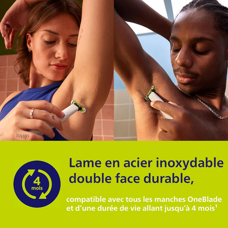 Le Philips OneBlade Intimate est un système de rasage et de tondeuse électrique hybride révolutionnaire conçu spécialement pour les zones sensibles telles que les aisselles et les parties intimes (du pubis, et des testicules à l'anus). Le rasoir intime offre une protection contre les irritations cutanées telles que les bosses et le feu du rasoir, quelle que soit la durée de la pousse des poils. Que votre routine de toilettage intime exige des lignes nettes ou une touche supplémentaire de style précisément là où vous le souhaitez. Vous voulez laisser un peu de poils. Cliquez simplement sur le peigne de coupe. OneBlade Intimate fait tout. Sa technologie de rasage comprend une lame à mouvement rapide (100x par seconde), qui permet de couper n'importe quelle longueur de poil. Son système de triple protection, ses bords arrondis, sa protection du pont de la peau et ses pointes arrondies, rendent le rasage facile et confortable. Chaque lame de rechange peut durer jusqu'à 4 mois¹. Vous pouvez l'utiliser humide ou sec, avec ou sans mousse, même sous la douche. Un must pour votre zone intime. ¹Remplacement tous les 4 mois pour une meilleure expérience de rasage. Sur la base de 2 rasages complets par semaine. Les résultats réels peuvent varier.
